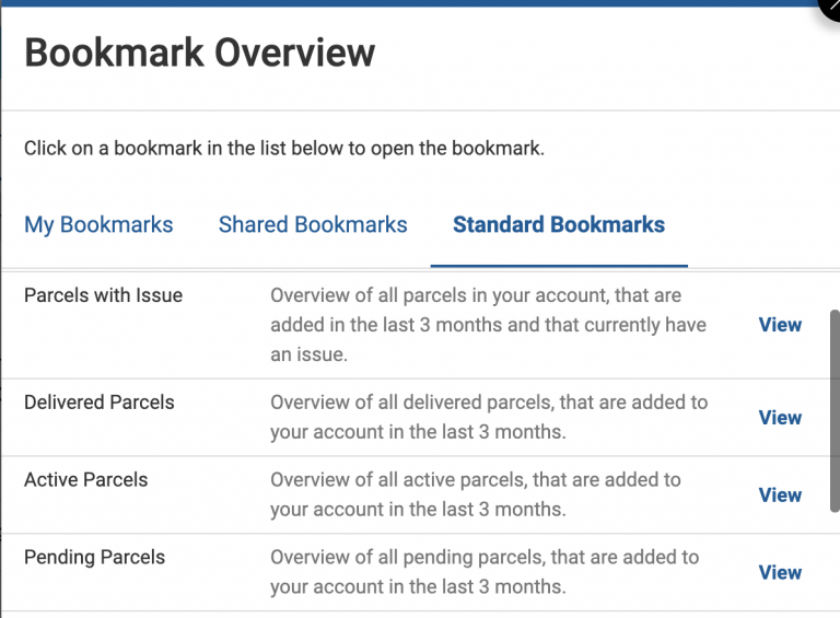 To get you started on using this feature, our team has created a series of Standard Bookmarks available to all Parcel Overview users for a quick summary of the parcels in your account sorted by delivery status. Either use this as an initial reference for your customer service operations, or get inspired to create your own!