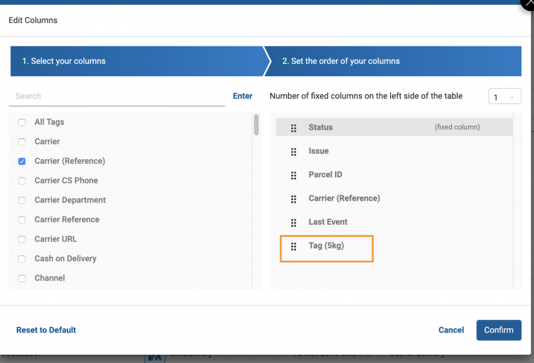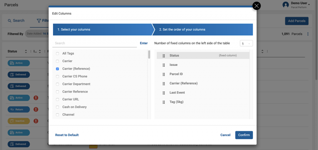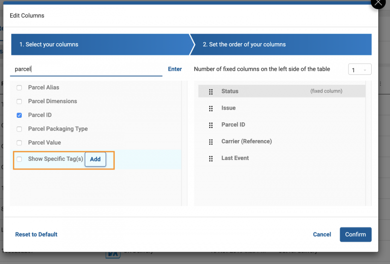Once you’re happy with your column selection, hit Confirm to apply your changes. You can also use Reset to Default to quickly re-apply the standard Column Selection to your Parcel Overview layout.