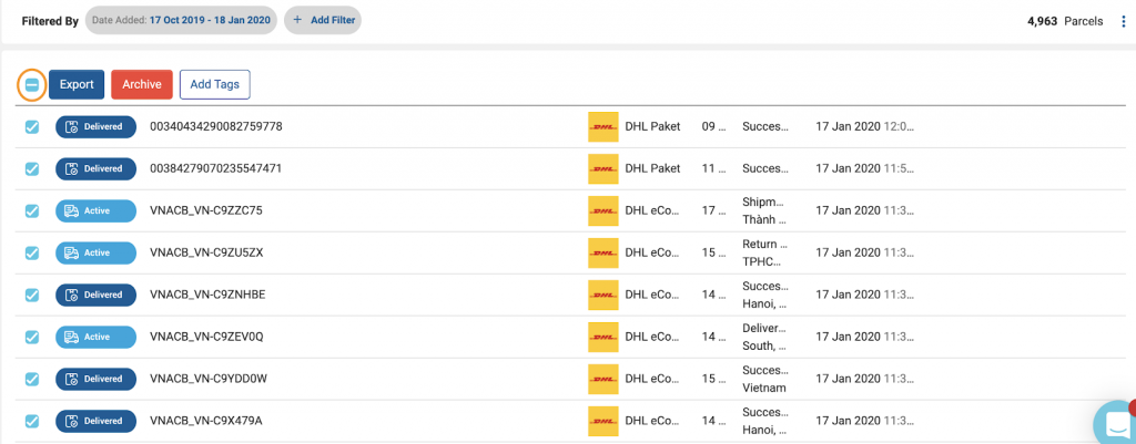 Quickly select one or multiple parcels to export, archive or add tags to a parcel selection.