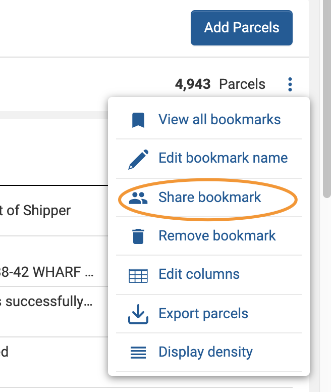Use the dropdown menu on the top-right corner to access your bookmarking features. Either use Save as bookmark to save your current Parcel Overview configuration as a bookmark or View all bookmarks to see all bookmarks associated with your organisation.