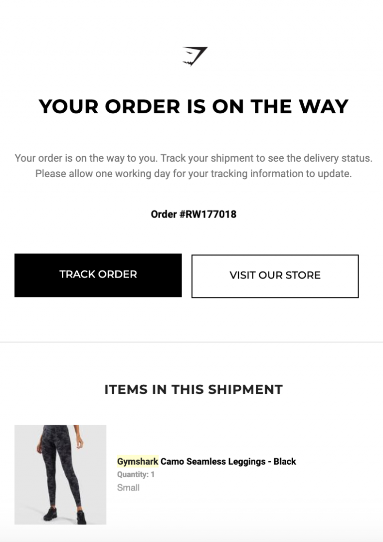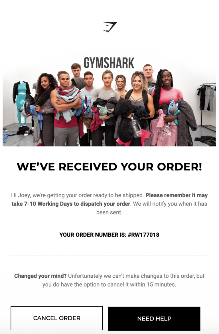 They should also know what to do if they encounter any issues in the meantime. For example, look at this order confirmation email from Gymshark: