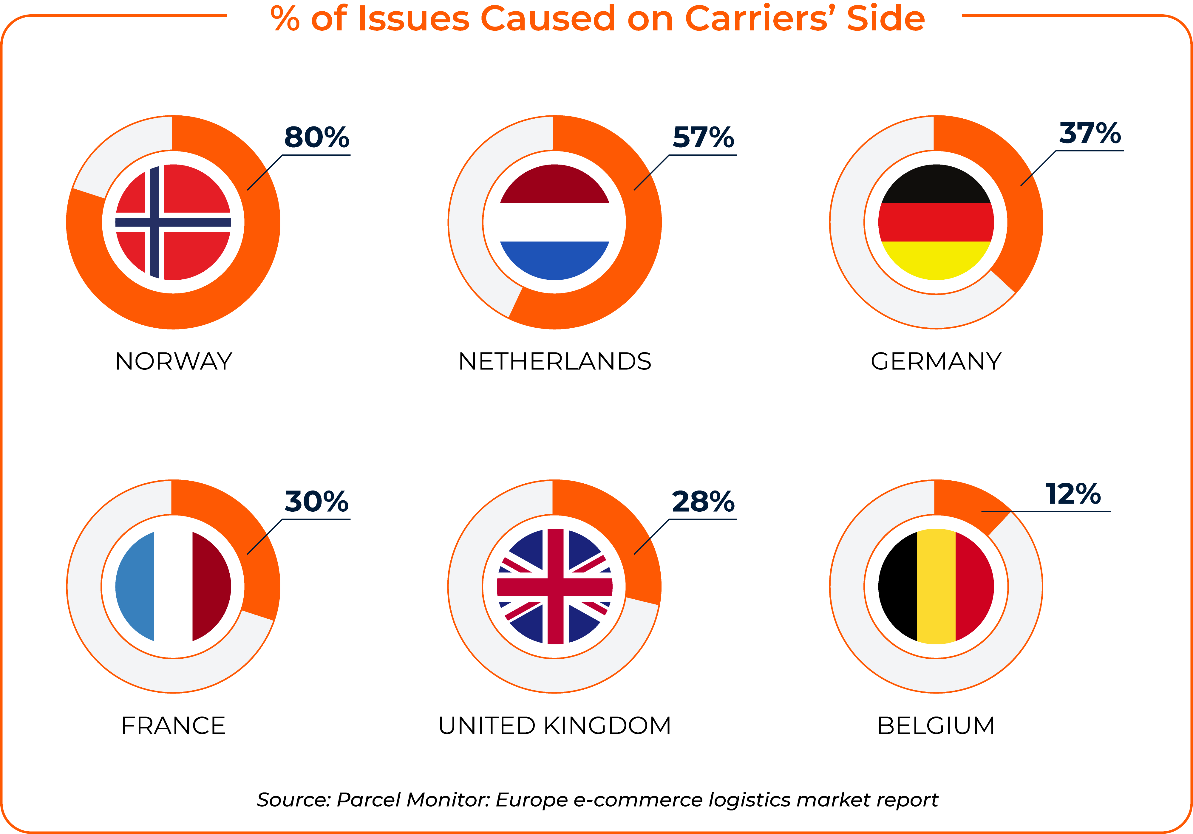 On the recipient side, involuntary returns were one of the most common delivery issues. Oftentimes, this happens because customers are not updated on when their orders will arrive. For carriers, one of the most common problems was unforeseen delivery delays. In countries like Norway and the Netherlands, most of the delivery issues were carrier-related. In Germany, France, and Belgium, delivery issues were customer-related.
