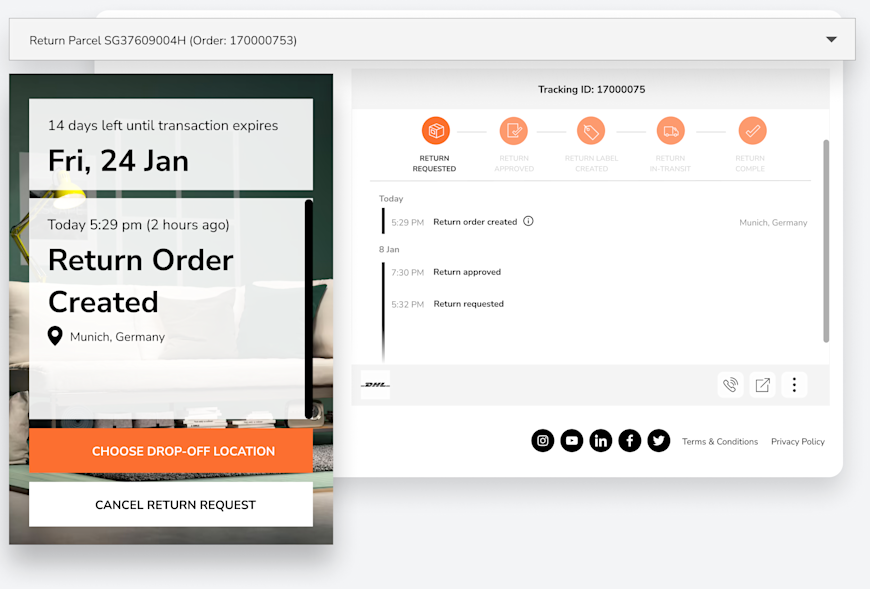 Returns Experience streamlines your returns process to better retain revenue while reducing costs. It includes self-service returns integrated into your website, policy automation, and refund alternatives such as exchanges. We support all convenient returns options across major carriers and 700,000+ drop-off points.